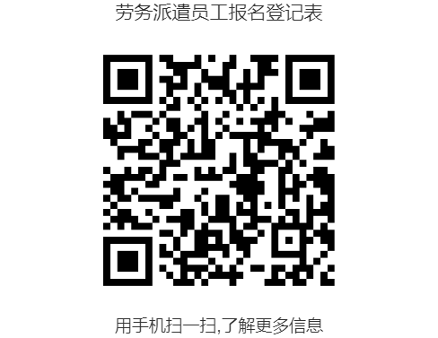 3、要求:報(bào)名人員必須符合本簡(jiǎn)章所規(guī)定的招考條件和要求,如實(shí)填寫《勞務(wù)派遣員工報(bào)名登記表》(掃描下面二維碼填寫),提交身份證(要求掃描正反面)、戶口本(戶口簿戶主頁(yè)及本人頁(yè))、相關(guān)學(xué)歷證書(以上均需原件電子版照片),近期免冠照片紅、藍(lán)底二寸照片添加至報(bào)名登記表;