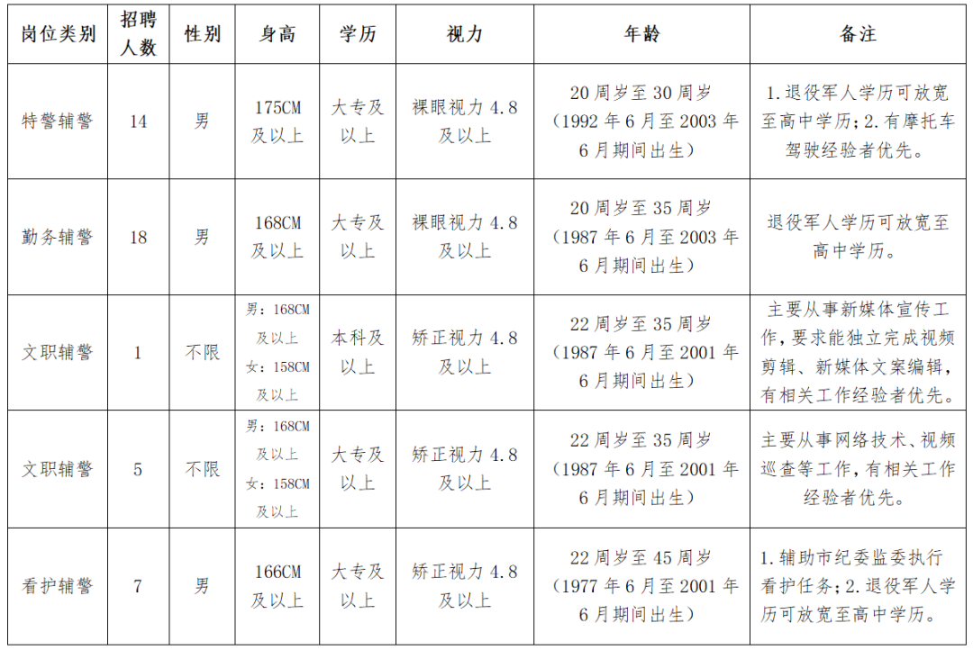 本次計(jì)劃招聘輔警45名,崗位設(shè)置及要求如下: