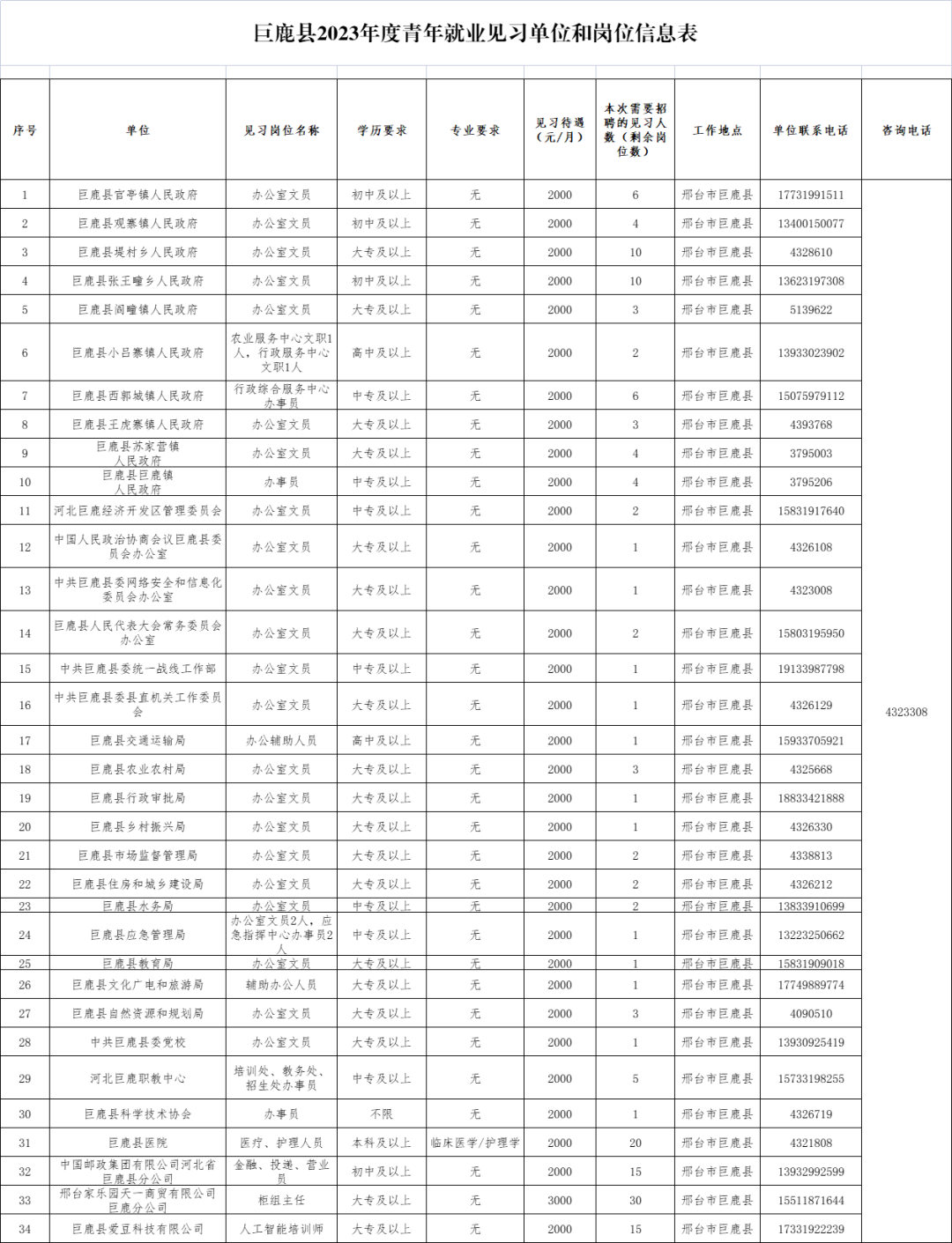 各見習(xí)單位提供的崗位名稱、數(shù)量、學(xué)歷專業(yè)要求和聯(lián)系方式等內(nèi)容詳見《巨鹿縣2023年度青年就業(yè)見習(xí)單位和崗位信息表》(附件),有報名需求的人員可自行下載查閱。