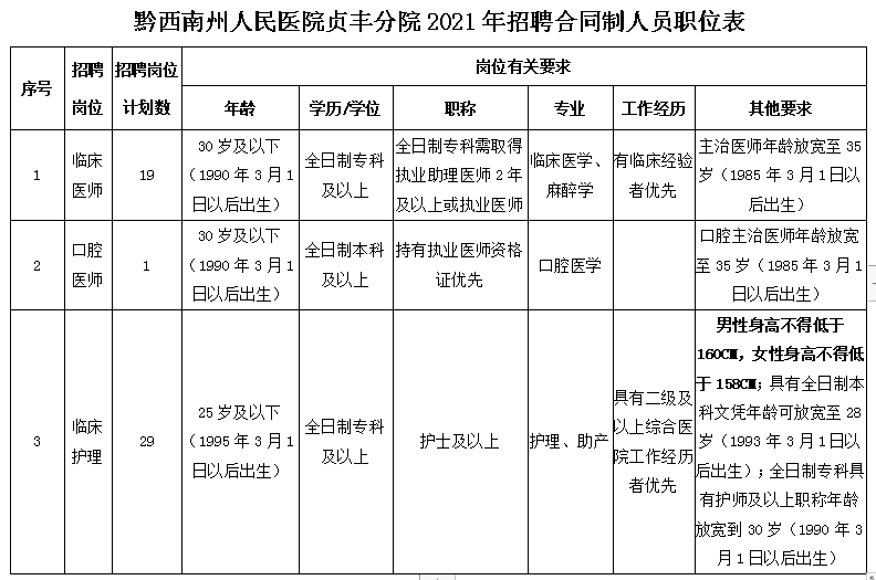 5.招聘崗位、相關(guān)要求詳見附件(黔西南州人民醫(yī)院貞豐分院2021年招聘合同制人員職位表)。