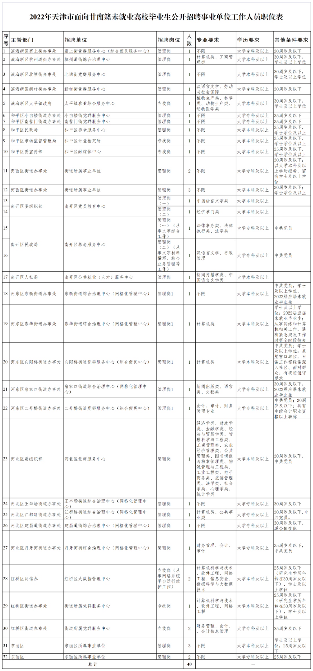 本次招聘工作按照“統(tǒng)一報名、統(tǒng)一考試、統(tǒng)一聘用”的原則,計劃招聘40名甘南籍未就業(yè)高校畢業(yè)生到天津市有關(guān)區(qū)所屬事業(yè)單位工作。