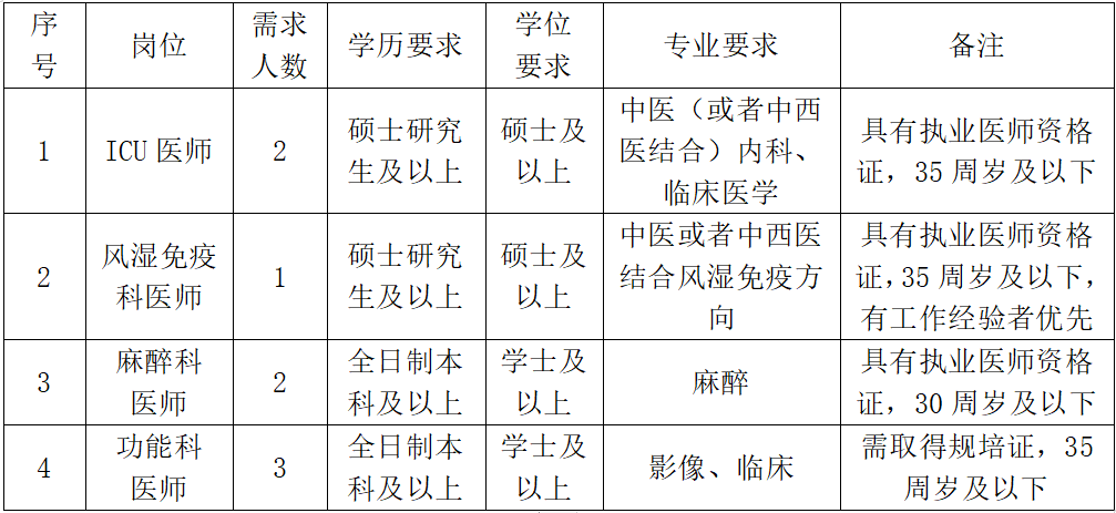 1.崗位條件:招聘科室、專業(yè)、人數(shù)見下表: