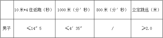 2、體能測試標(biāo)準(zhǔn)和項(xiàng)目參考《關(guān)于印發(fā)公安機(jī)關(guān)錄用人民警察體能測評項(xiàng)目和標(biāo)準(zhǔn)(暫行)的通知》(人社部發(fā)〔2011〕48號)執(zhí)行,男性測試立定跳遠(yuǎn)、4乘10米往返跑和1000米中長跑。(具體體能測試合格標(biāo)準(zhǔn)見附件1);體能測試設(shè)1名專業(yè)體育老師及1名工作人員組成技能考核組,對招聘崗位報名人員進(jìn)行體能測試,每名人員只有一次體能測試機(jī)會。