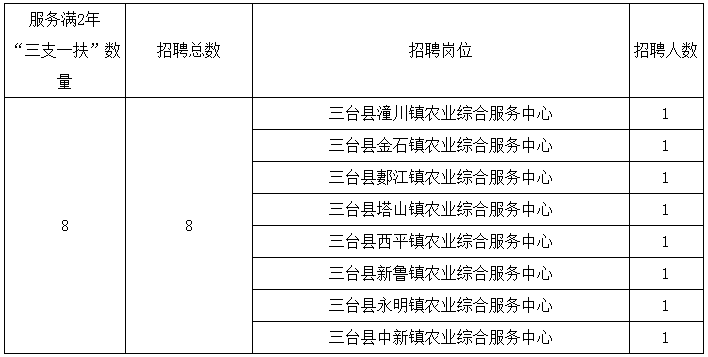 具體條件:招聘單位、招聘人數(shù)見《三臺縣2023年從“三支一扶”高校畢業(yè)生中直接考核招聘鄉(xiāng)鎮(zhèn)事業(yè)單位工作人員崗位需求表》。