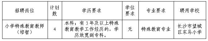 (1)小學(xué)特殊教育教師(培智)崗位:學(xué)歷要求為本科;有3年及以上特殊教育教學(xué)工作經(jīng)歷的(不含校外機(jī)構(gòu)工作經(jīng)歷),學(xué)歷放寬到專(zhuān)科。專(zhuān)業(yè)要求為特殊教育專(zhuān)業(yè)。
