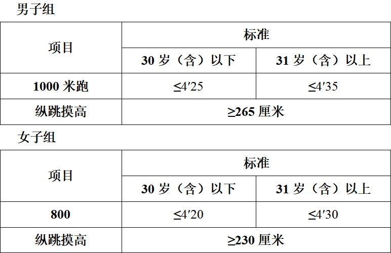 計(jì)算機(jī)成績(jī)達(dá)到合格線(xiàn)人員進(jìn)入體能測(cè)評(píng)環(huán)節(jié)。測(cè)試內(nèi)容為跑步(男性1000米、女性800米)、縱跳摸高。測(cè)試標(biāo)準(zhǔn)參照《公安機(jī)關(guān)錄用人民警察體能測(cè)評(píng)項(xiàng)目和標(biāo)準(zhǔn)(暫行)》規(guī)定執(zhí)行(附后)。